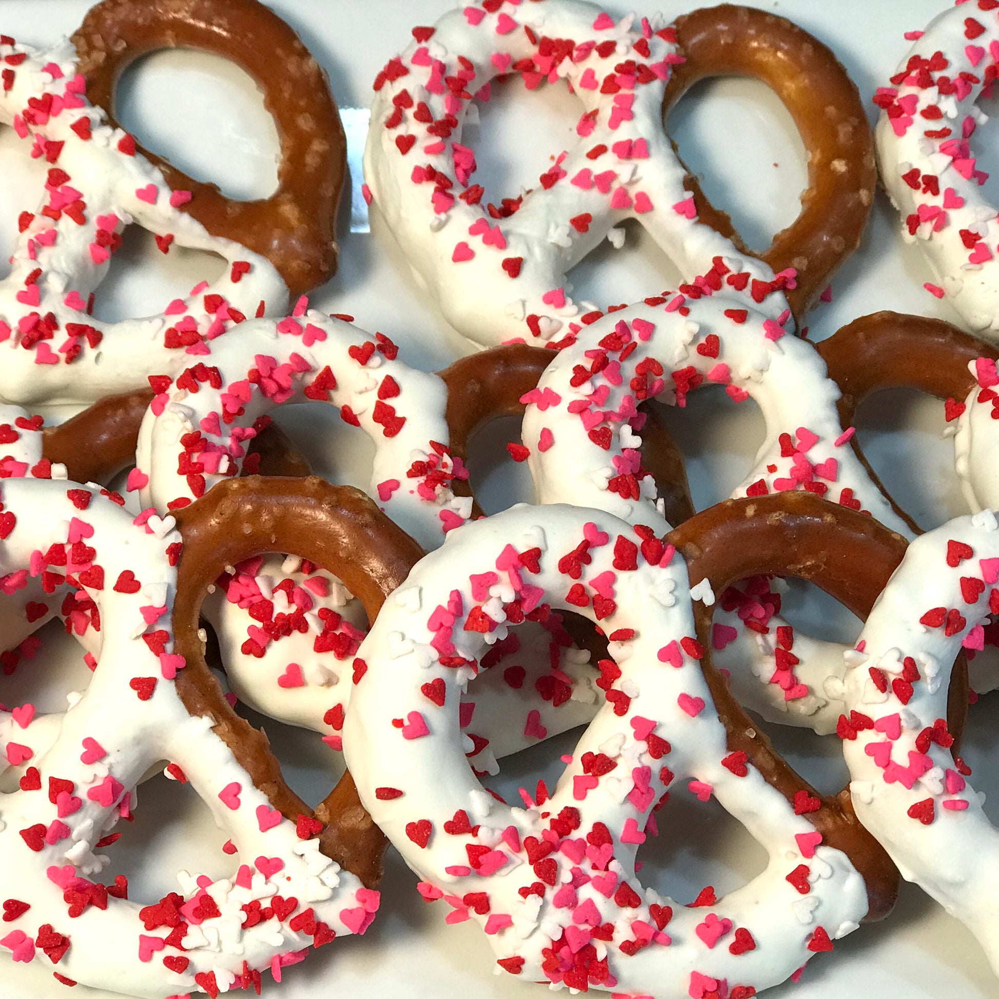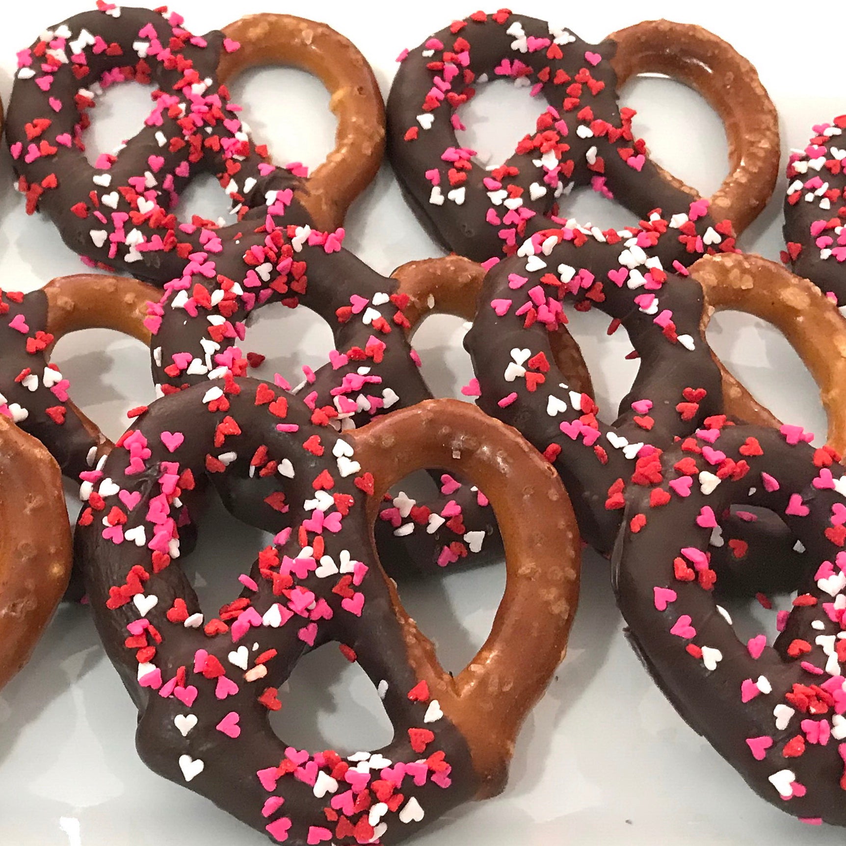 - 1/2 Dozen Chocolate Covered Jumbo 3" Pretzels: Topped with tiny heart sprinkles. (Large: A full dozen Jumbos.)