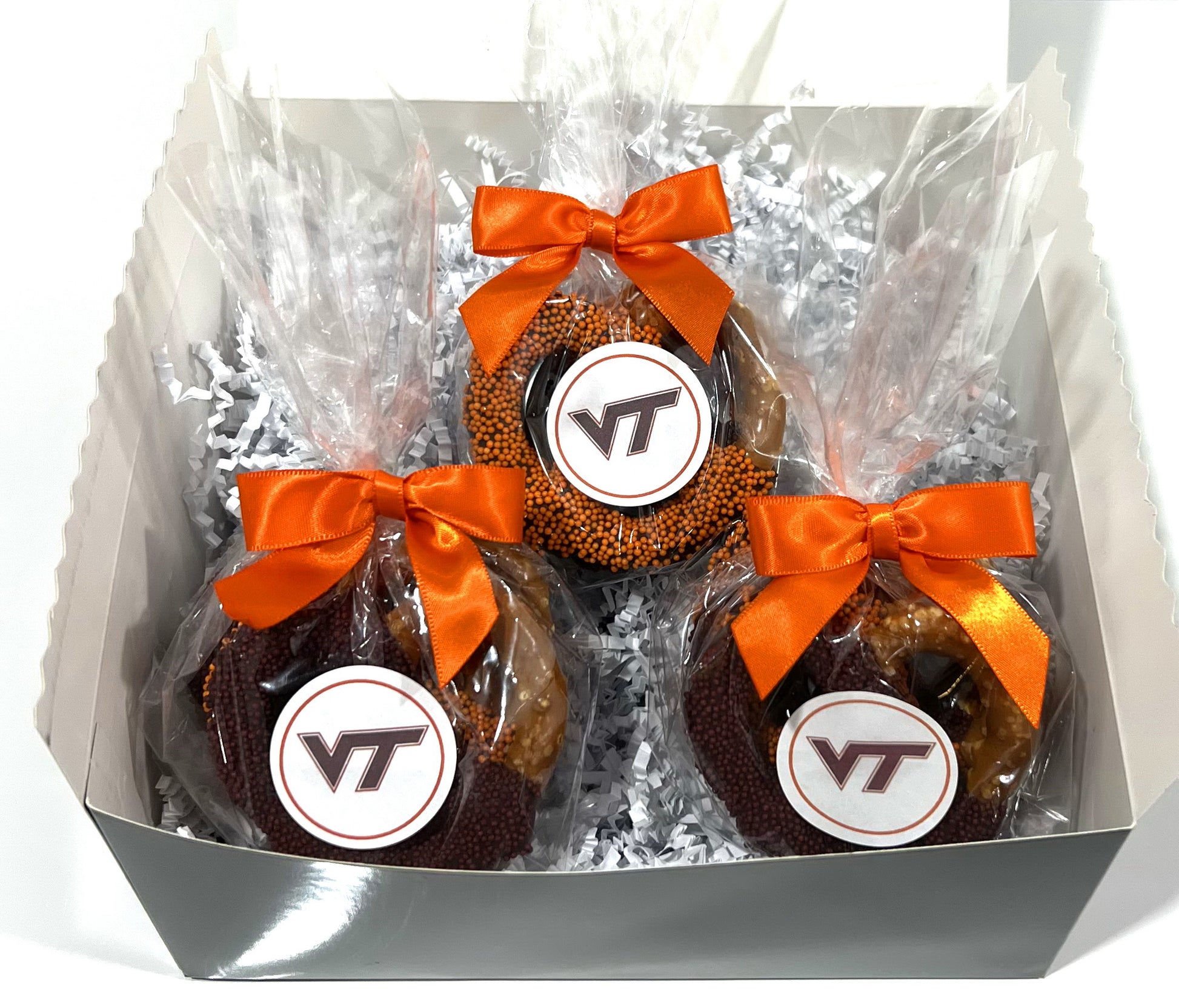 For all of you Virginia Tech fans, these yummy large 3" pretzels are dipped in chocolate and topped with Virginia Tech colored sprinkles. These are the perfect sweet and salty treat and make a wonderful college care package/gift for exams, graduation, any time, birthdays, sorority/fraternity gift, for a VT alumni, or any VT fan. Each order is beautifully packaged. (Exact packaging may vary based on availability.)