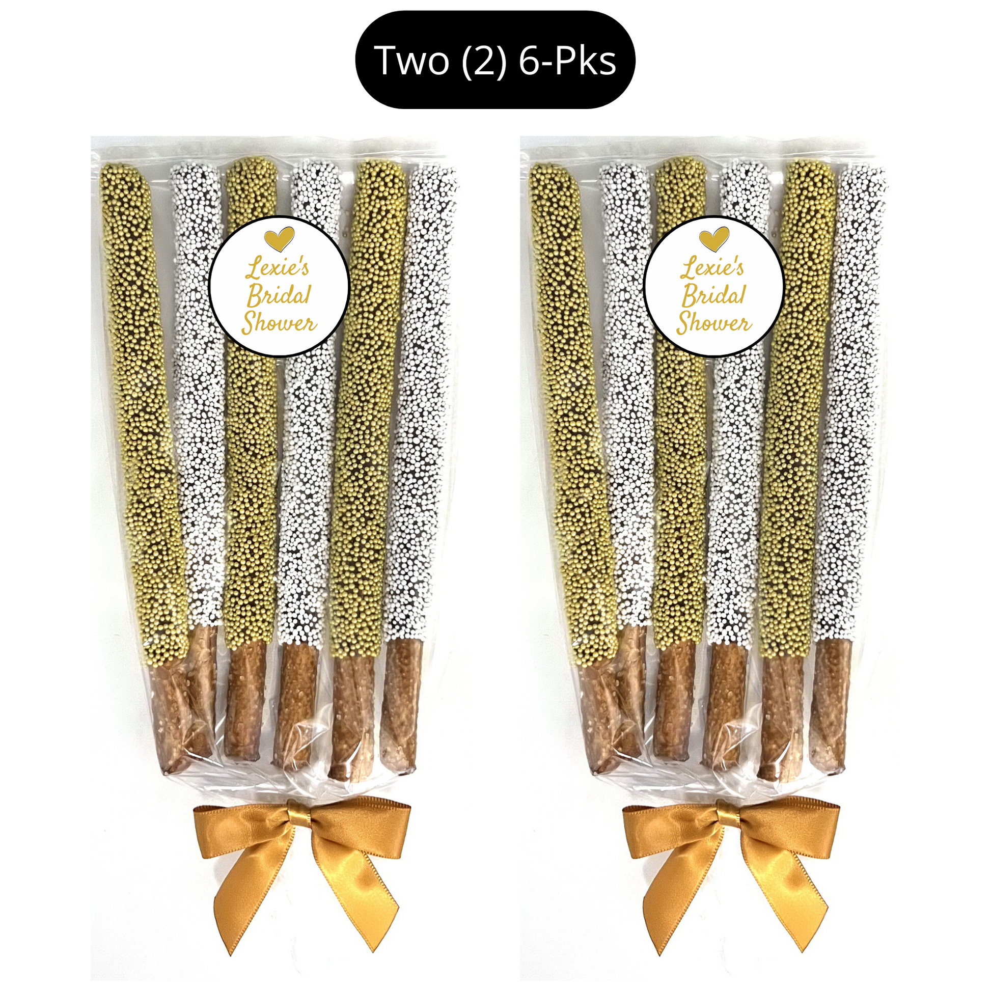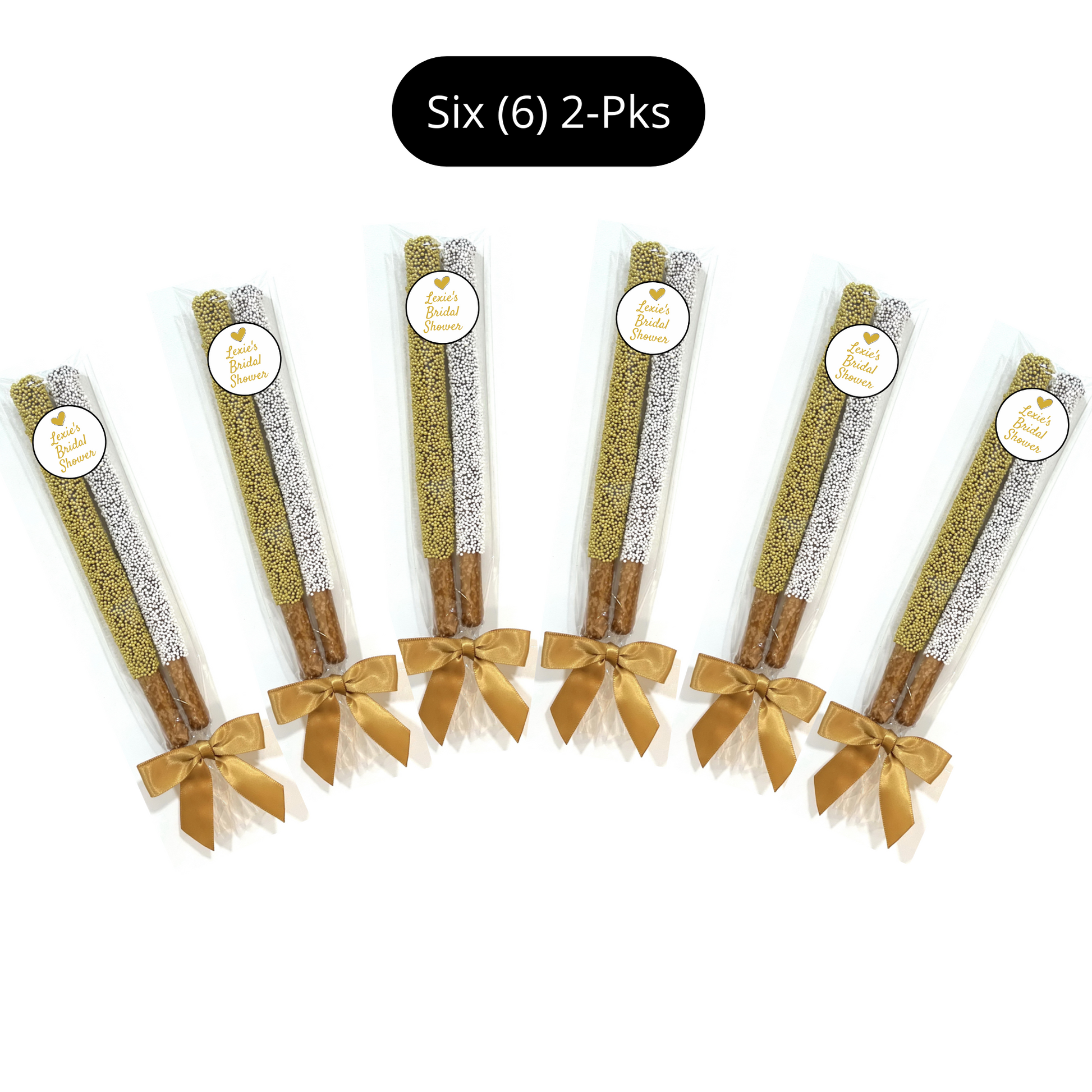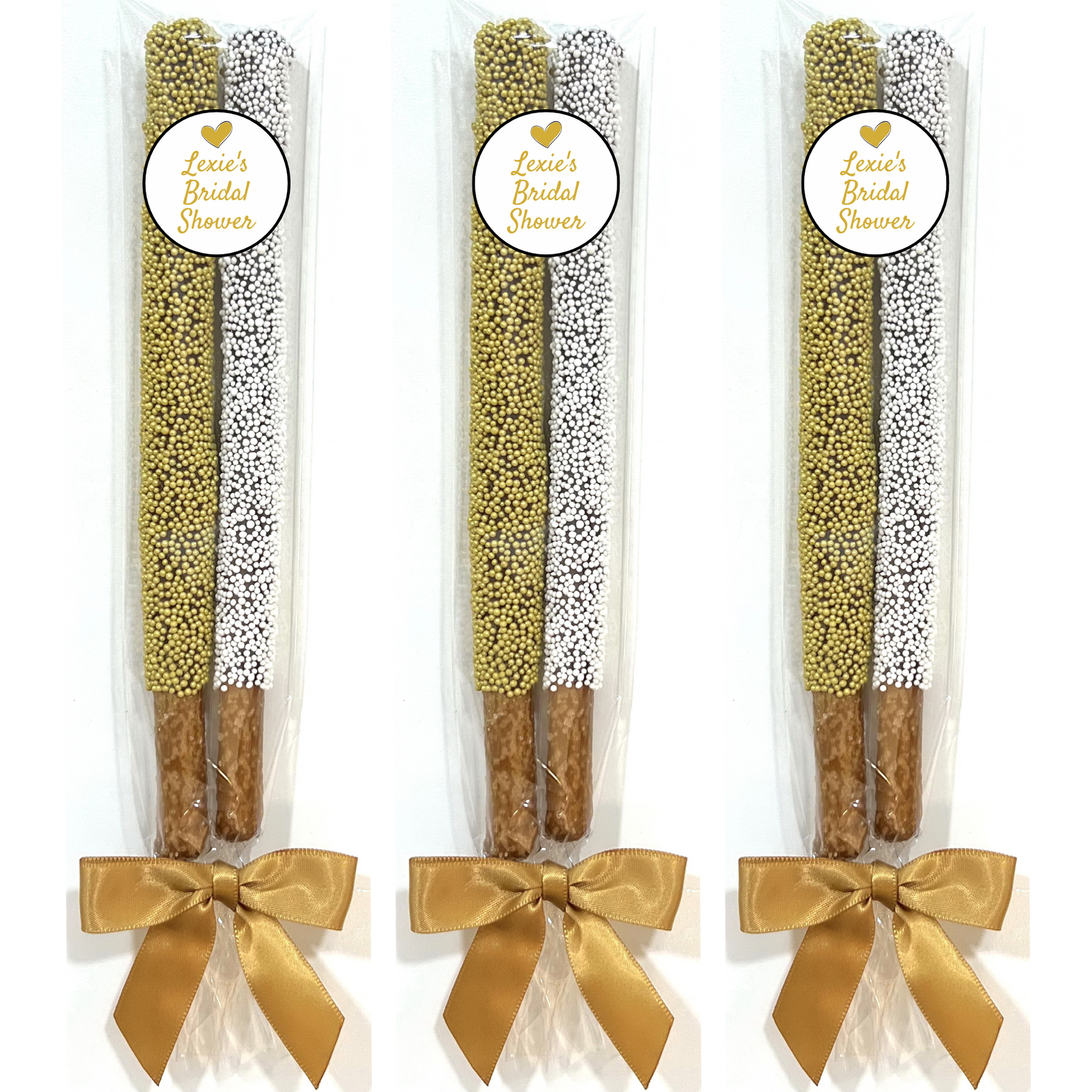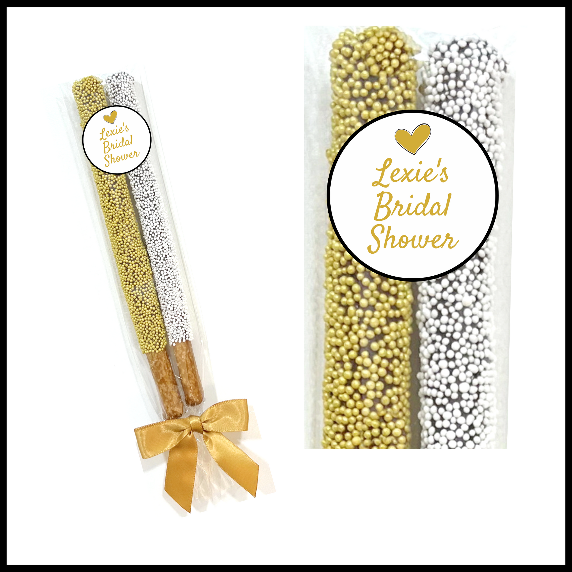 Elegant gold and white chocolate pretzel rods beautifully packaged, with "[Bride's Name] Bridal Shower" labels, make the perfect statement for your Bridal Shower, or any facet of your wedding event. They are great for wedding favors, rehearsal dinner favors, hotel gift bags, bachelorette parties, engagement parties, and more. They are deliciously sweet and salty. Bows will vary between gold and white, based on availability. See additional pictures.