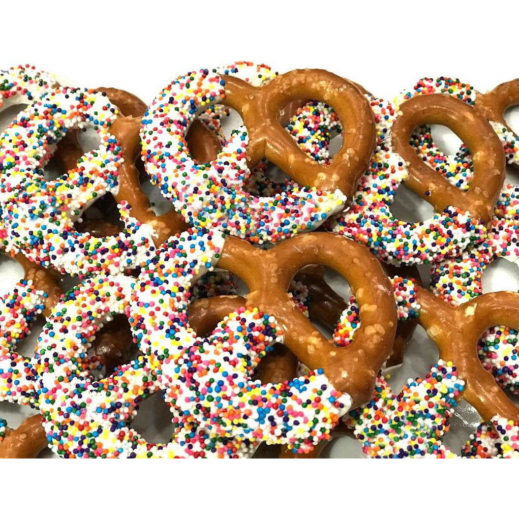 These yummies are large 3" pretzels dipped in white chocolate and topped with brightly colored sprinkles. These are the perfect sweet and salty treat to eat at home or give as a gift. Each order is beautifully packaged. (Exact packaging may vary based on availability.)